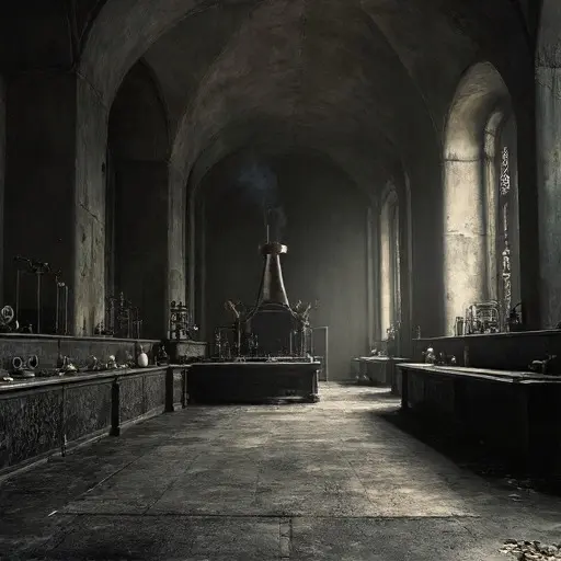 Alchemist Master Elementum Vacuum was last heard working in his laboratory, followed by a sudden, intense sound of heavy metal grinding and glass shattering (from the alembic still and the crucible furnace) and then immediate, profound silence. He did not leave the manor. The next morning, the laboratory was cold, the Philosopher’s Chamber sealed, and the man was gone. No body was found, and the only evidence was the singular, physical alteration to his final philosophical work.