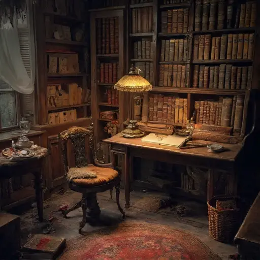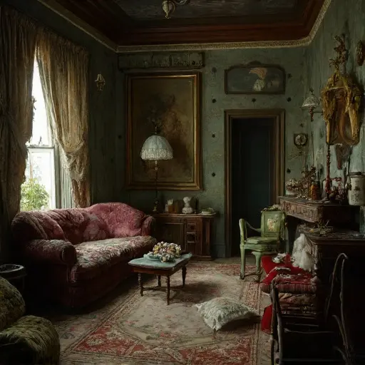 The parlour of Averinth Moorspindle House feels shaped by an ordinary routine quietly thinning until it could no longer hold itself intact. A faint blend of cooled tea, worn wool, and the metallic hint of long-settled ink lingers in the softened air. Upholstery bears the hollows of former habits, as though even the cushions recall evening postures more faithfully than memory.
