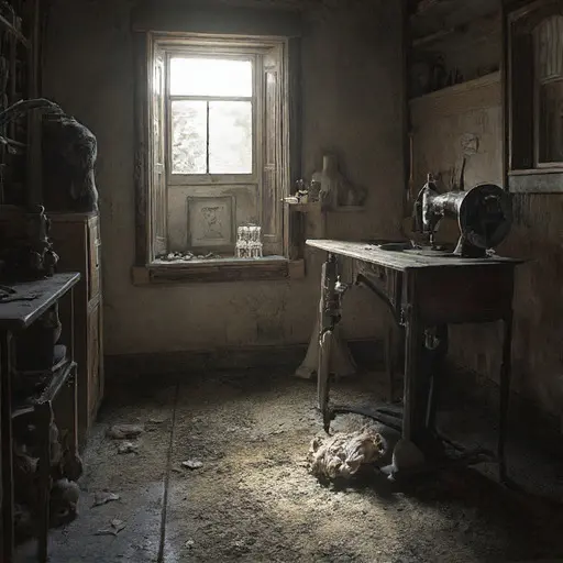 Cedar Knot, a manor built on generational wealth derived from the Manchester mills, was the workplace of Miss Clara Beaumont, the family’s Textile Specialist from 1890 to 1915. Clara’s role was crucial: she managed the acquisition, care, and repair of the manor’s extensive, high-value collection of aristocratic garments and household linens, requiring specialized knowledge of fabric science and preservation. Her workroom, a sunless annex to the main linen press, still contained the tools of her trade. Along one wall, a rack of heavy, wooden clamps and specialized shears sat idle, their blades dulled with rust. The pervasive atmosphere was dry and cold, imbued with the sharp, acidic smell of aged chemicals used for stain removal and preservation. The most immediate sign of Clara’s sudden absence was a detailed Withered length of Belgian lace, half-stitched to a piece of muslin, left precisely threaded onto the needle of her sewing machine, suggesting a swift, mid-stitch departure.