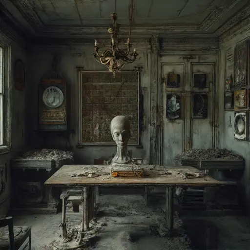 The ultimate chilling clue is the small hole in the laid paper. It is the final conception—the Zero Thought achieved, representing the cessation of all cognitive existence and the perfect, objective truth found in a single, un-dimensioned point of pure, absolute nothingness. The broken mirror and blank paper ensure no further attempt could be made to chart the flawed, thinking world. This abandoned Victorian House, with its silent chambers and broken tools, stands as a cold, imposing testament to the master thinker who pursued the ultimate, pure form of reason, and who, in the end, may have successfully defined the Perfect Non-Self, vanishing into the un-aware, objective finality that he engineered as his final, terrifying statement of pure existence.