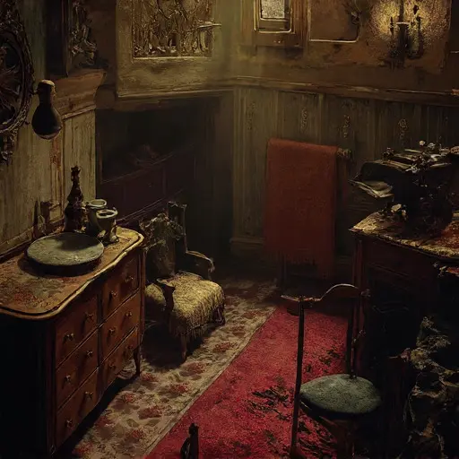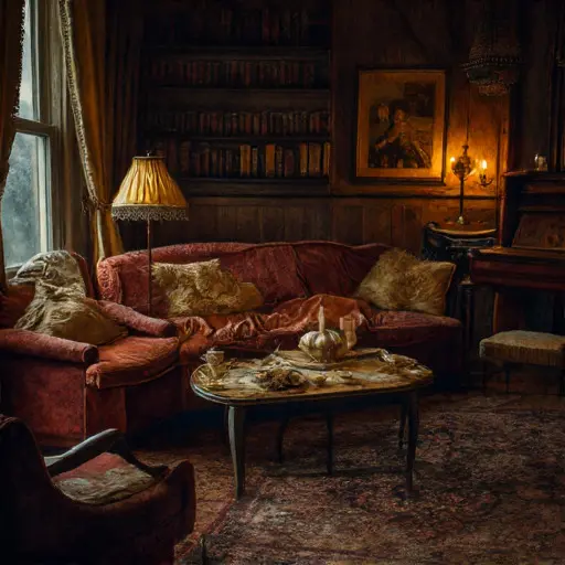 The parlour of Duskharrow Vellthorne House receives footsteps like a place that has forgotten the shape of sound. Dust drifts upward in faint spirals from rug creases; stale wool and cooled tea scent the air. The furniture seems to listen inwardly, curves and cushions shaped by habits long stilled.