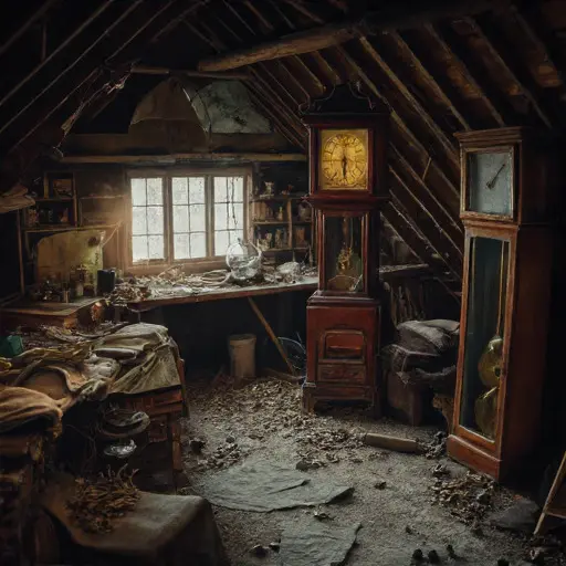 The house’s quiet heartbeat seems loudest here. August Thalen, the reclusive clockmaker who once claimed these rooms, left behind more than metal and gears. His unfinished creations sit in neat rows, halted mid-movement, their hands forever poised before a moment that never arrived. Drawers remain open where he sorted delicate parts by candlelight, and a worn journal lies on the bench, its pages curled but still inked with calculations and confessions. Some nights, locals whisper, faint ticking drifts from the attic though nothing inside has moved in decades. The workshop feels suspended between longing and regret, a space where time obediently waited for its master to return.