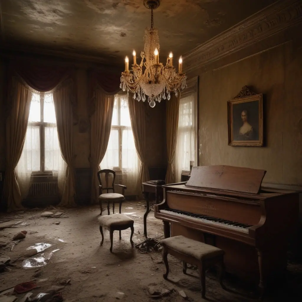 The parlor seems frozen in a melancholic stillness. You can picture the soirées once held here — glittering chandeliers, clinking glasses, music that never quite died. Now, only the faint hum of the wind passes through broken panes. Portraits of the Ebonvale family still hang on the walls, their eyes following you, their smiles cracked and brittle with time.