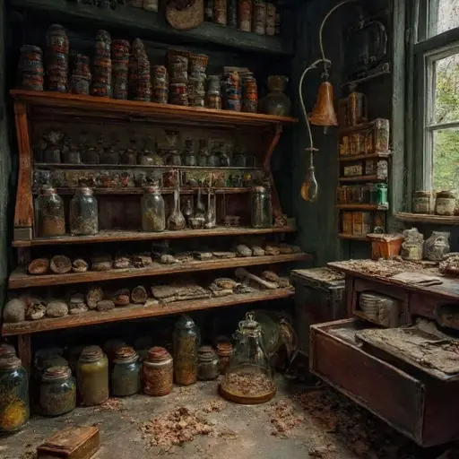 The workbench dominates the room, covered in powders, vials, and mortars. Cabinets brim with dried roots, seeds, and tinctures carefully labeled in Whitmore’s neat hand. Scattered papers reveal formulation notes for proprietary remedies. A faint outline of a chair imprint in dust suggests recent use before sudden abandonment. Everything remains poised for continued work, yet untouched for years, creating a quiet, haunted atmosphere.