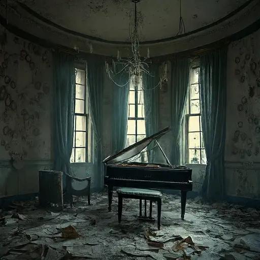 Venturing deeper, I reach the music room, where a fractured chandelier scatters pale reflections across a grand piano sealed beneath a gauze of dust. A few keys remain pressed, as if held down by invisible fingers still shaping Marian’s favorite lullaby. The walls are crowded with portraits whose eyes follow with uncanny precision, their varnish cracked like old riverbeds. Among them hangs a sketch of the botanist herself, unfinished yet tender, capturing her cautious smile. A chill travels the corridor, and I hear the careful drip of water collecting in a distant basin, echoing like measured footsteps. Every object seems poised to speak, yet chooses restraint, guarding the mansion’s deeper wounds. When a faint floral scent curls through the gloom, I understand the house is not merely remembering— it is reaching outward, waiting for someone willing to listen to its quiet plea.