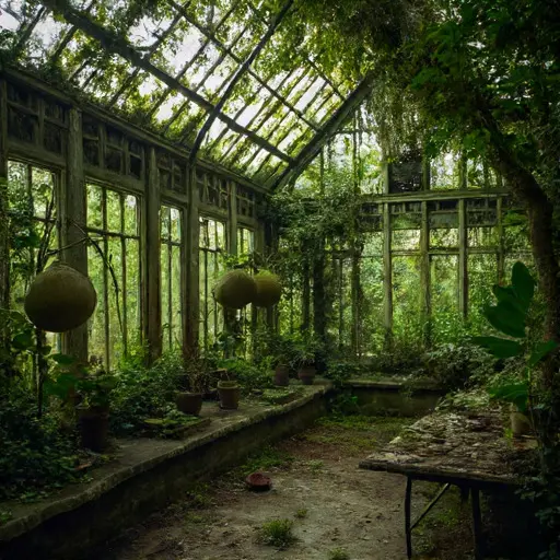 In the western conservatory, time feels suspended. Glass panes veiled with moss refract the dim glow into wavering emerald patterns across the cracked tiles. Here lived Marian Thale, the house’s devoted botanist, a woman whose gentle fascination with rare blooms bordered on reverence. The remnants of her work remain scattered like clues: a brass mister dulled by neglect, notebooks swollen with moisture, and a lattice of withered vines still gripping their trellises with fragile determination. As I trace the imprint of her careful steps, the house seems to hum with faint botanical murmurs—gentle tapping, soft rustling, rhythmic notes of a once-tended Eden. Marian’s last entry lies open on a warped table, ink blurred yet legible enough to whisper her fear that something in the mansion listened to her secrets. The air thickens, and I sense her presence lingering beside me, urging caution.