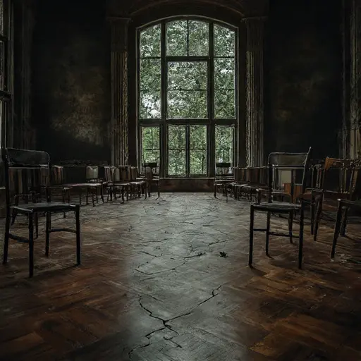 Upstairs, the ballroom dominates the entire wing. The parquet floor, once polished for extravagant events, is warped and pale. This room was Silas’s showpiece, where he would host parties to display his wealth and precision. Yet, like everything in the abandoned Victorian house, the current state suggests a sudden, panicked retreat. A single, small, faded silk slipper lies near a window, its heel snapped. The heavy silk curtains are ripped, and the atmosphere suggests not a gradual fading, but an instantaneous cessation of life and sound.