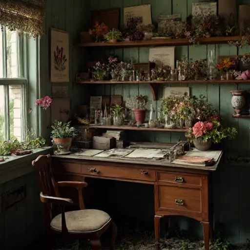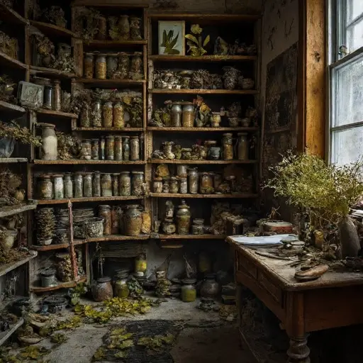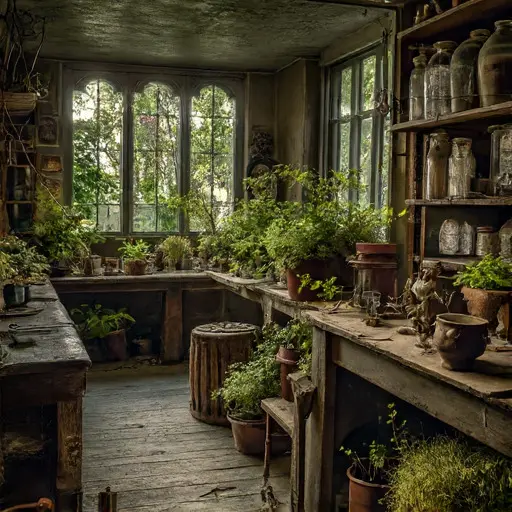 Open journals, dried specimens, and soil-stained tools reveal interrupted growth. The plant bench, terrariums, and labeled jars testify to a botanist’s devotion suspended mid-work. The conservatory is abandoned, yet every object whispers of care, curiosity, and suspended study, a precise record of halted exploration and patient observation.