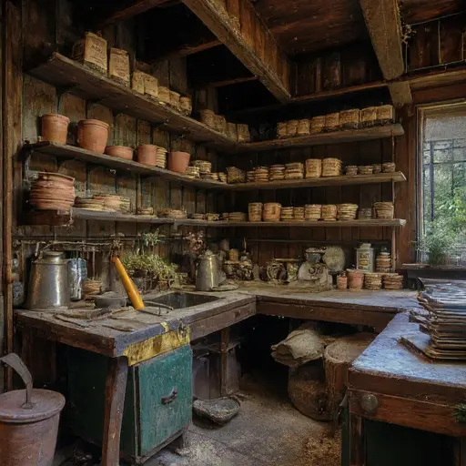 Pressed specimens lie brittle, pots cracked, journals half-filled. The central bench, tools, and glass cloches remain as if expecting her return. The greenhouse is abandoned, yet the cultivation of Clara Langford lingers, a silent testament to dedication halted by frailty, every leaf and soil mark preserving traces of a life devoted to plants and meticulous care.