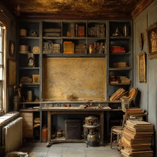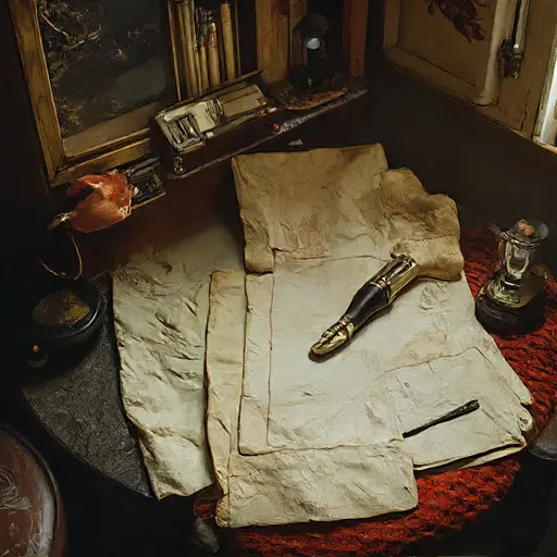 Late commissions brought contradictions: sailors disputed his latest depictions, insisting he misplotted a reef. In the supply niche, a compass shows a warped needle clinging to one side of its housing. A coastal register bears a smudge where Santiago pressed too hard, as if steadying himself. Isabel’s embroidered cloth is snagged on a drawer pull, its thread snapped. A wax seal affixed to a bundle of testimonies is fractured into dull fragments, hinting at tense revisions he never resolved.