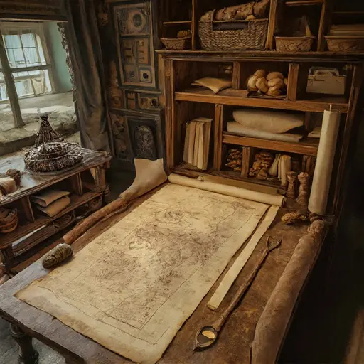 The quiet within Valdés House thickens in the map-room, where dust traces the absence of footsteps. Here Santiago Emilio Valdés once charted distant coasts drawn from maritime testimonies. Now, a single chart remains unsettled on the table, its corners resisting the calm that has overtaken every drawer and compass.