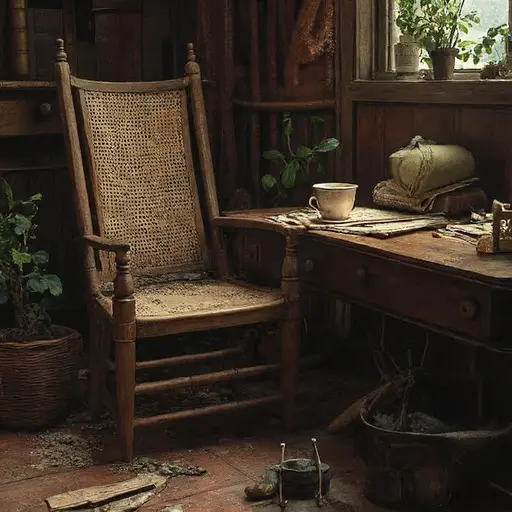 Cornelis, bookbinder, born 1871 in Delft, trained under his father Pieter Van der Meer, whose worn apron hangs behind the door. Each dawn he dampened boards for casing, cut signatures by noon, and stitched gatherings long into lamplit evenings. His persistence remains visible: plough blades sharpened in a straight row, linen thread wound tight on wooden spools, presses oiled and aligned with mild precision. Nothing suggests haste—only the tender vow of routine once held firm, now wavering at its edges.