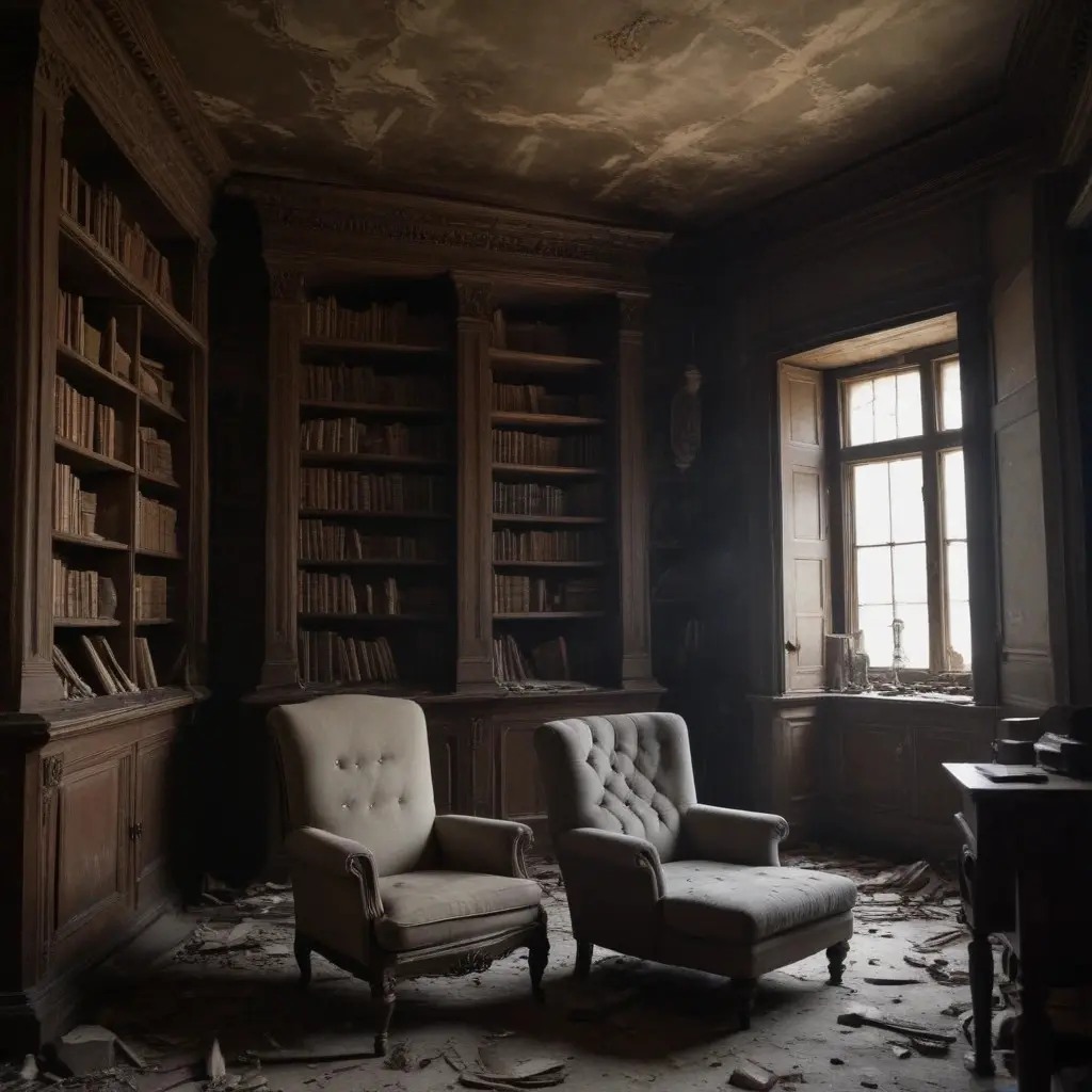 Perhaps the most captivating room in this haunted mansion is the library, where thousands of forgotten books whisper stories to the silence. Some pages are stuck together with age, others burned along the edges. Locals say the library lights flicker at night — though there’s no electricity left to explain it.