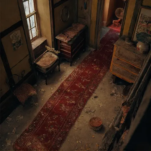 Along the south corridor, Caldria’s boots rest angled inward, their laces hardened by disuse. Jorlen’s warped clasp blanks scatter near the wainscot. A cracked lamp chimney sits beside a dust cloth she dropped during what became her final attempt at order.