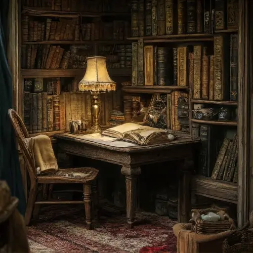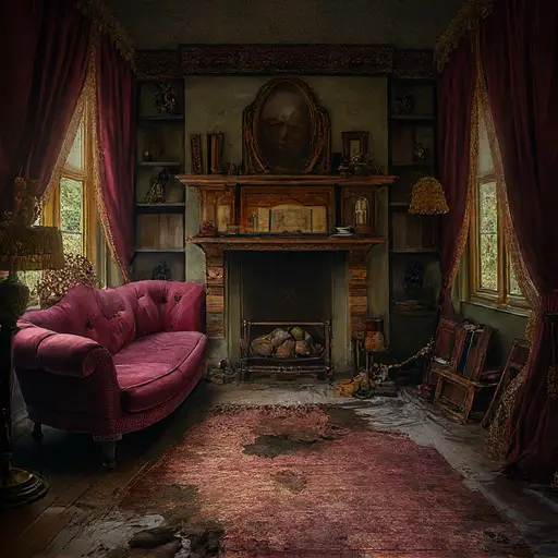 The parlour of Eldrath Mirethorn House holds a quiet shaped by slow attrition rather than sudden abandonment. Cooled tea, wool fibers, and the faint metallic breath of old ink hover in the softened air. Upholstery curves inward where evening routines once pressed themselves deeply, leaving impressions that long outlasted the hands that made them.