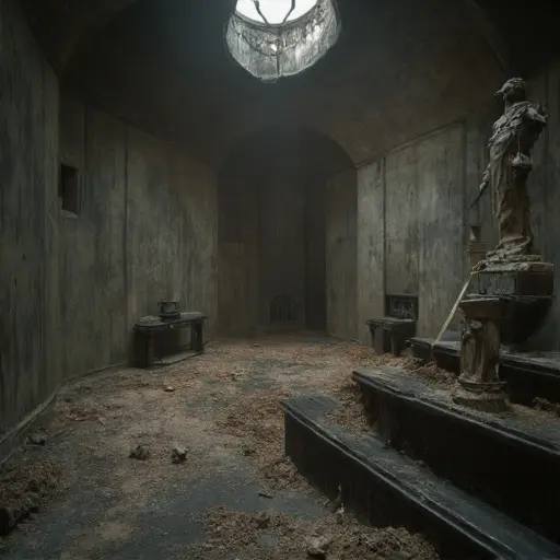 Moralist Master Virtus Vacuum was last heard working in his study, followed by a sudden, intense sound of heavy wood grinding and metal snapping (from the Justice statue and the printing press) and then immediate, profound silence. He did not leave the manor. The next morning, the study was cold, the Conscience Chamber sealed, and the man was gone. No body was found, and the only evidence was the singular, physical alteration to his final philosophical work.
