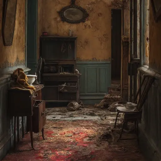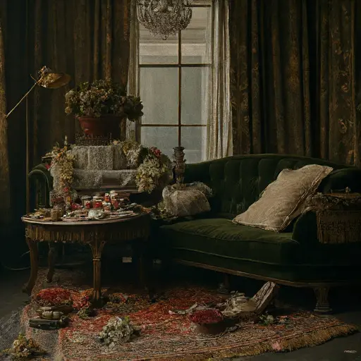 The parlour of Fallowrest Nythrindale House preserves the final pause of a routine once steady: stitching half-done, supper cooling unnoticed, teacups left to settle beneath a film of dust.