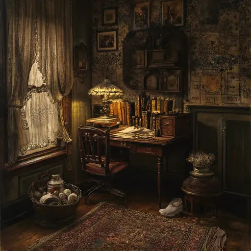 Her afternoons belonged to quiet mending, her evenings to arithmetic pages reviewed by lamplight. But when Selbor’s income vanished and winter stiffened her hands, her certainty dissolved. Thread baskets grew tangled, corrected slips went untouched, and each day’s structure softened into gentle disarray. The bills they failed to meet forced a hasty departure, leaving the interior behind to sag into stillness.