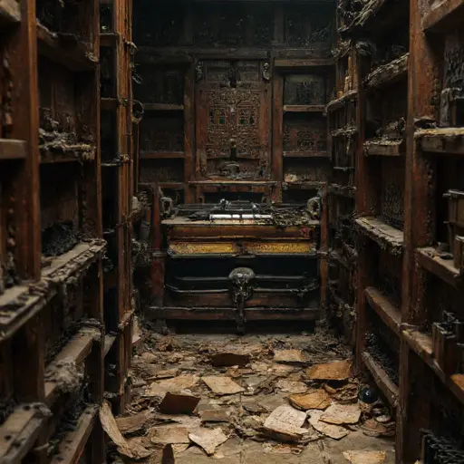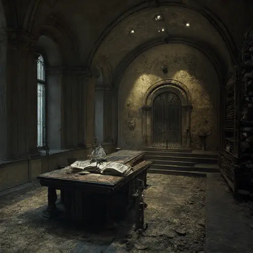Historian Master Scripta Vacuum was last heard working in his chamber, followed by a sudden, intense sound of heavy wood crushing and metal snapping (from the lectern and the stamp) and then immediate, profound silence. He did not leave the manor. The next morning, the chamber was cold, the Chronicle Chamber sealed, and the man was gone. No body was found, and the only evidence was the singular, physical alteration to his final philosophical work.