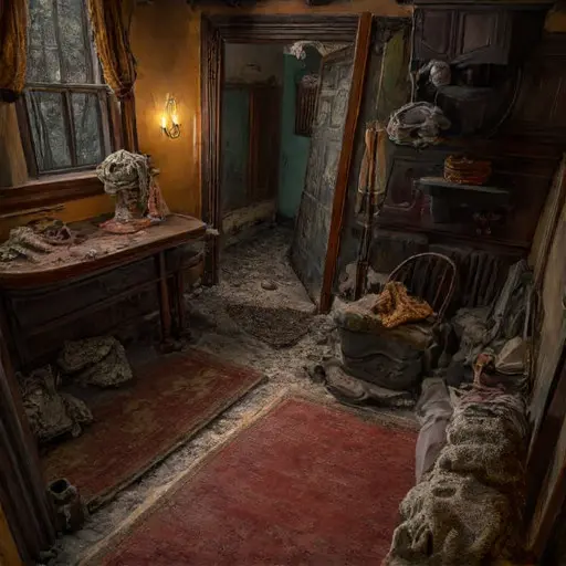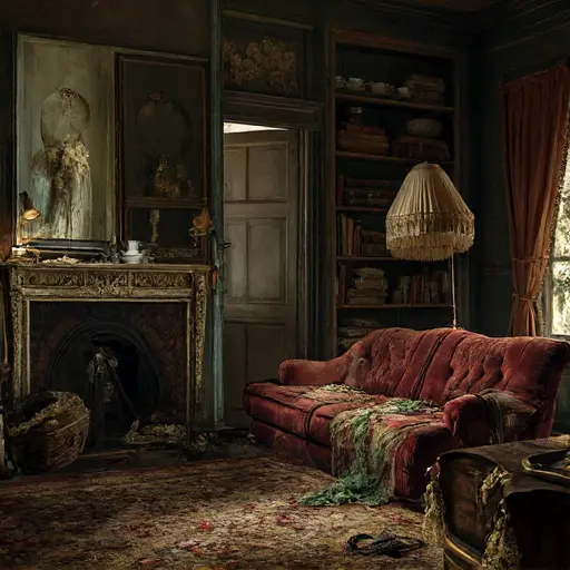Crossing the parlour of Fernwythe Callamoor House, the stillness feels textured, settling into every softened armrest, every dust-dulled curve of wood. The keyword shaded settles naturally into the folds of curtains and the low glow cast by the single lamp. Dust lifts in faint ribbons as footsteps disturb the thick quiet.