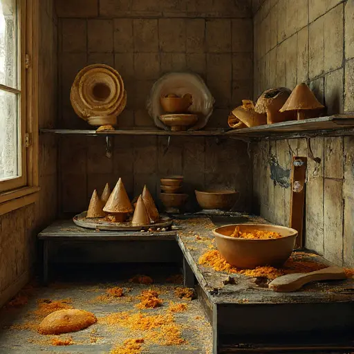 Whispers spread after a grand hotel returned a display center, saying its sugar spires collapsed overnight—an unexpected failure from João, long admired for architectural precision in his sweets. In the interior corridor, Beatriz’s apron ties lie torn near a stool. A lattice sketch slumps near the wainscot, its curves overwritten in wavering charcoal. Beneath a narrow shelf sits a fractured piping nozzle, though no broken tip lies nearby. A faint track of powdered sugar marks a single stair tread—evidence of mixtures handled with an increasingly unsteady grip. None of these fragments prove error outright, yet each inches toward a tension João never named.