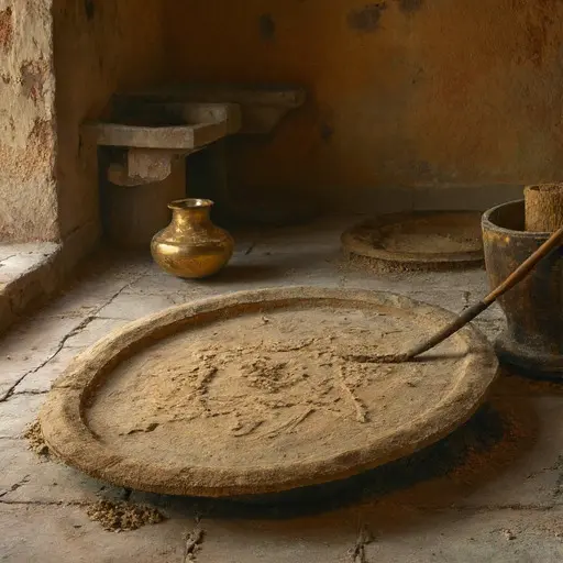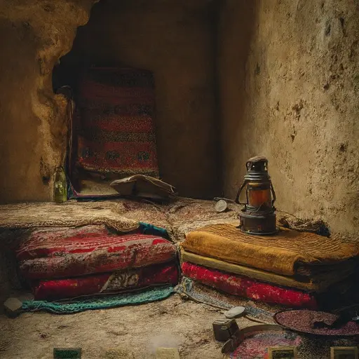 Farid practiced mapping and augury here each evening: smoothing sand into level fields, scoring lines of measurement, and testing angles by lantern glow. Order lingers in small traces—rods stacked by length, sketches tucked into ceramic jars, a coil of string stretched taut across a tray’s rim. Even the shallow dip at the center of the floor mats remembers the angle of his posture, kneeling to revise a design he seldom trusted.