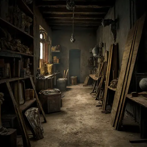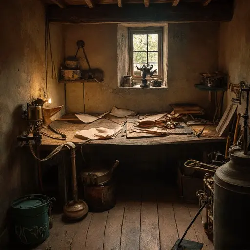 A wooden straightedge lies warped, as if soaked too long. The compass set’s hinge is stiff with dried ink, as though he snapped it shut in haste. Even the lamp stutters, its wick trimmed unevenly, leaving soot smudges on the rafters.