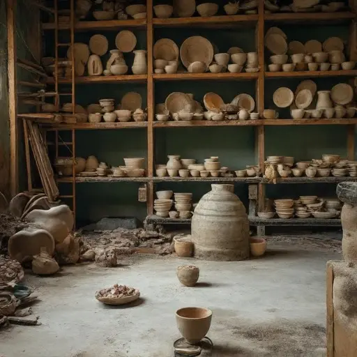 A pressed quiet inhabits Shimizu House, concentrated in the abandoned firing parlour where Tatsuhiro Kenji Shimizu, born 1877 in Kyoto, shaped humble vessels for neighborhood households and tea gatherings. The frayed contour on his final rib tool hangs in the air like a confession he could not finish making. Bowls, brushes, and torn paper patterns remain where he left them—arranged with the unthinking care of someone who expected to return after a short pause.