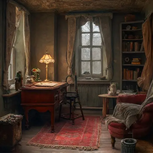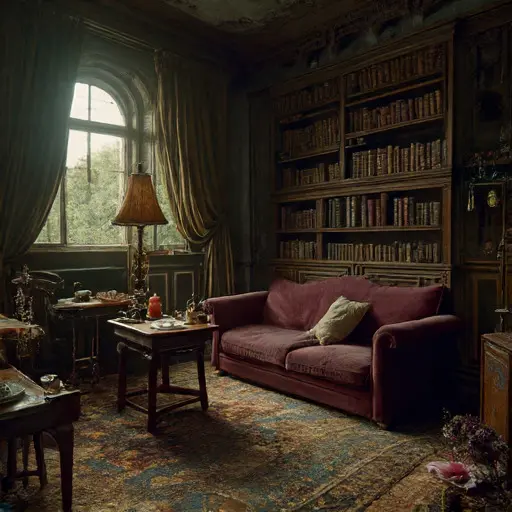The parlour of Frostwynd Halcendore House holds a quiet that seems worn into the very fabric of the room. The scents of cooled tea, dried wool, and ink long settled in their bottles still faintly mingle in the still air. Upholstery curves inward where evening habits once repeated, and each object sits exactly as the last gesture left it.