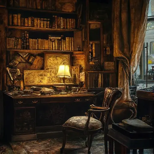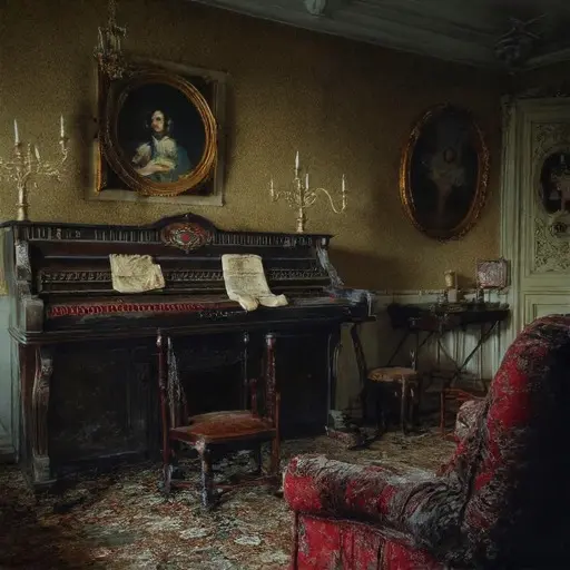 Below the study, the parlour still carries the pulse of evenings filled with distant thunder and restless pacing. Maps pinned beside the hearth rustle when no breeze should reach them. A locked trunk sits stranded in the corner, its brass hinges green with disuse, whispering of expeditions abandoned mere days before departure. Visitors claim they sometimes hear faint scribbling, like a quill dragging across parchment. Others describe the sensation of someone standing just behind them—quiet, intent, unwilling to let the world forget the work left undone.