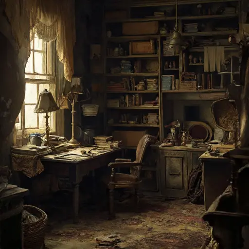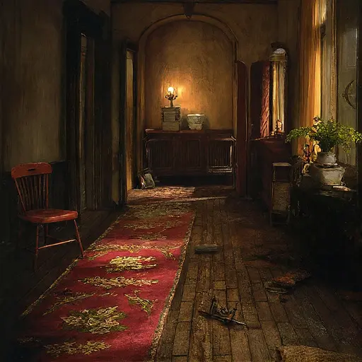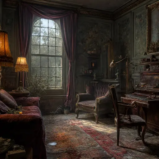 Crossing into the parlour of Gloamspire Rynthollow House, one feels the delicate hush of routines suspended long before their completion. Dust rises in thin ribbons from the rugs; stale wool and cooled tea mingle in the softened air. Every curve and fold of upholstery bears the imprint of repetition—smoothed arms, sagging cushions, warped boards beneath heavy footfall.