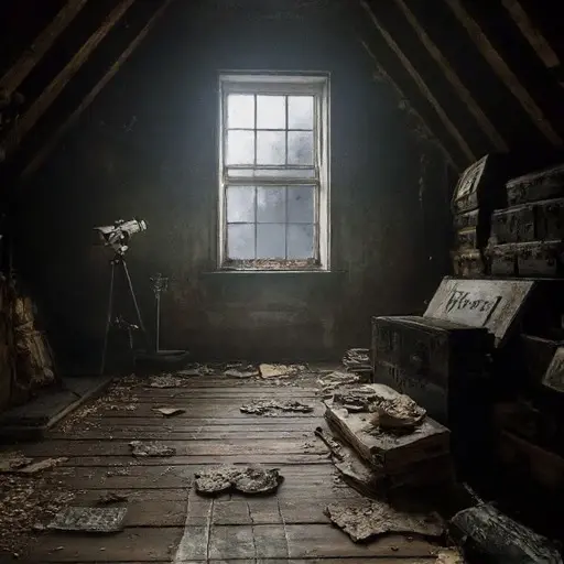I climbed into the attic and found Marris’s telescope still aimed at the mist outside, as though waiting for a sky that no longer existed. Trunks spilled their contents—letters addressed to no one, fragments of fabric, symbols repeating everywhere.