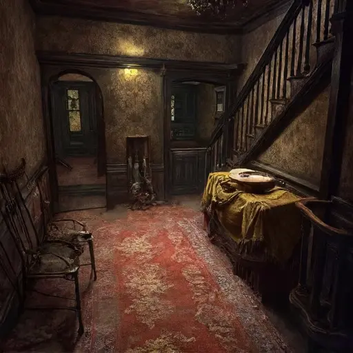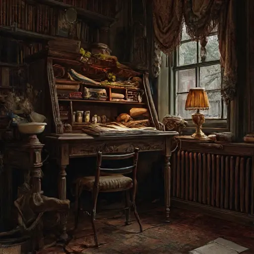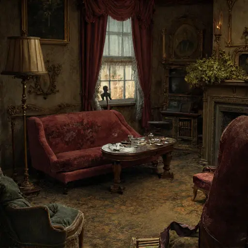 Stepping into the parlour of Grimshale Everlorn House, one senses the weight of years folded into fabric and paper. Dust softens the corners of the room, drifting in suspended ribbons whenever the air stirs. The faint scent of dried lavender and cooled tea lingers near the hearth, caught between collapsed cushions and bowed shelves.