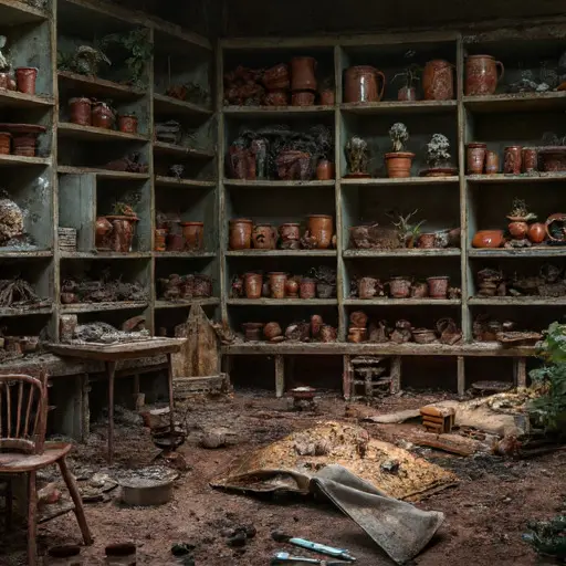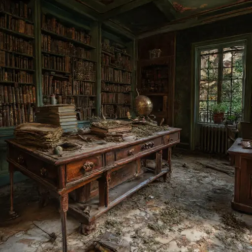 Pressed flowers, cracked pots, open notebooks, and ink-stained quills reveal a painstaking professional left in mid-task. Labels marked taxonomy, fragile glass containers, and sketches testify to a life of quiet obsession, frozen indefinitely.
