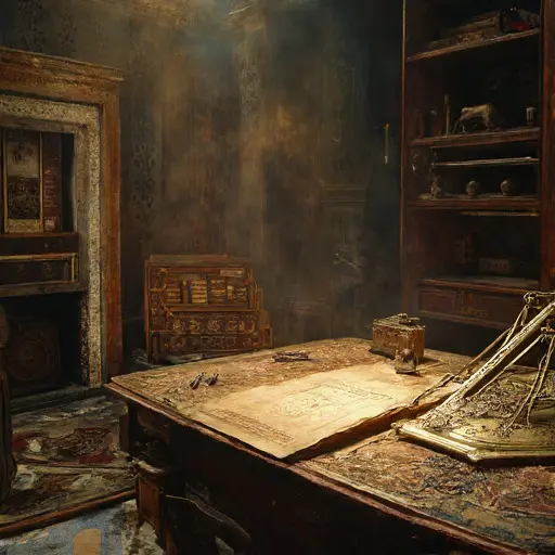 Rumor whispered that a prominent patron’s chart—delivered for an engagement celebration—held subtle inconsistencies in three planetary intervals, enough to raise uneasy murmurs among those who trusted Tariq’s once-unerring accuracy. In the interior corridor, Hana’s abacus pouch hangs torn at its seam. A parchment wheel rests crookedly near the wall, its pivot cracked. Beneath a carved damascene table sits a revision sheet, its ascendant values overwritten in trembling strokes. A faint trail of chalk dust marks a single stair tread, drifting in disordered grains—residue shaken loose from a hand no longer steady.