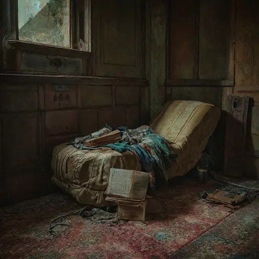 A subdued calm drifts through Calloway House, deepening as it reaches the abandoned bedroom, where astronomy’s quiet companions—paper, brass, and lamplight—linger in stillness. Here Edgar Lionel Calloway, an amateur astronomer with fervor exceeding means, spent nights charting foreign constellations across domestic furniture. Now the hesitant arc beneath the fallen chart marks the last curve of thought he never traced to completion.