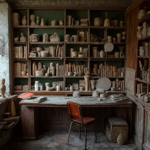 The iron-bound table dominates the atelier, coated in hardened oils and powdered plaster. Sculpting tools, brushes, and unfinished miniatures rest where Émile last worked. Drawings, some pinned to boards, others rolled, display studies of human anatomy and decorative motifs. Every shelf, drawer, and tray hints at suspended activity. The atelier is fully furnished, yet the absence of movement leaves a tension that evokes halted creation.