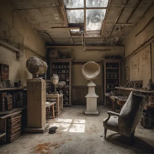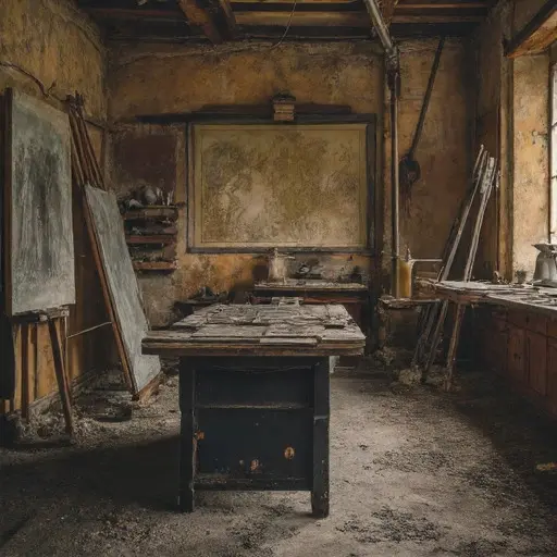 The atelier is steeped in sketching, each table littered with drawings and small sculptures paused mid-progress. The central worktable, coated with dried paint, reveals the meticulous gestures of an artist’s hand suddenly absent. Sketchbooks lie open, some with pencil lines smudged by forgotten fingerprints, signaling a focus now lost to time.