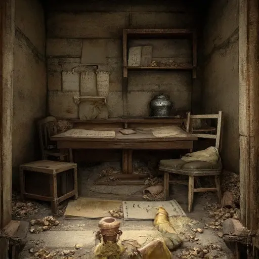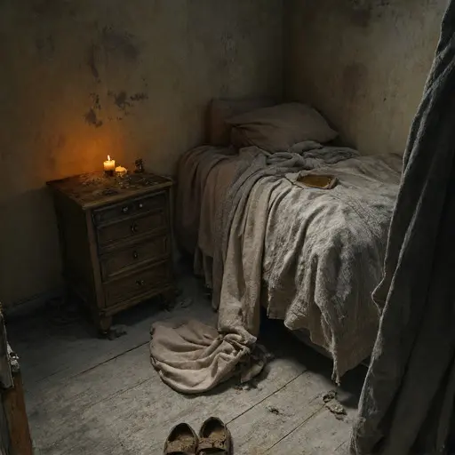 Rumor claimed Farhad misrecorded a merchant’s caravan weights, provoking disputes over duties owed along the route. In the upper hallway, Bahram’s abacus pouch lies torn beside a dented lantern cage. A rolled invoice sits crushed under the console, its seal fractured. A correction sheet has fallen near the stair tread, its final figures overwritten to near-illegibility. A loose bead from an abacus track gleams faintly beneath a cracked tile. None of it declares guilt, yet each sign inclines toward a mind shaken from its once-steady proportions.