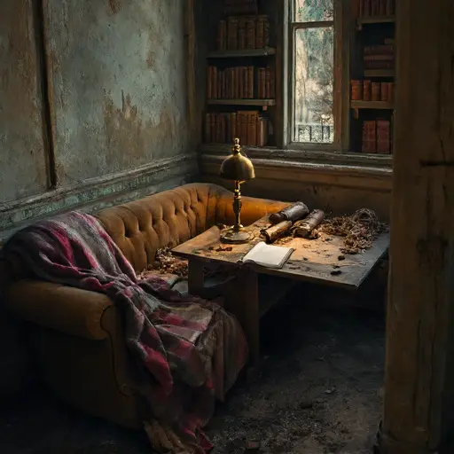 A muted heaviness settles across MacLeod House, deepest in the abandoned smoking room, where Ewan Alastair MacLeod, a modest Scottish poet of local affection, once arranged his drafts among pipes and hearth-embers for want of a calmer study. Now that single lifted page recalls a moment he never allowed himself to finalize.