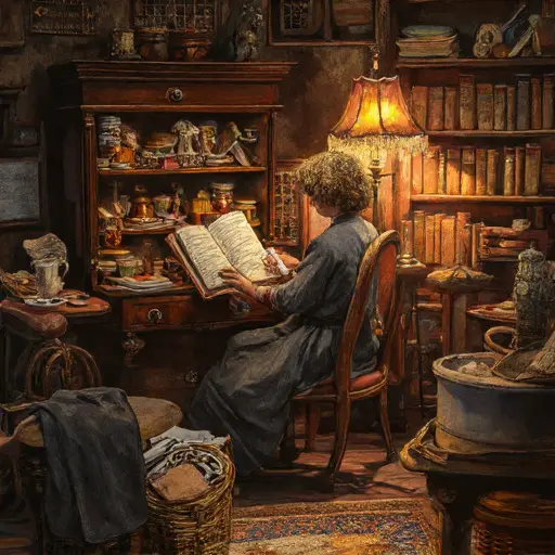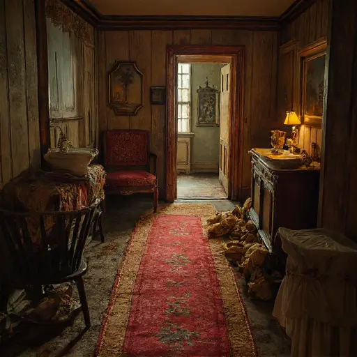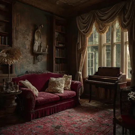 The parlour of Lirawend Throskember House feels shaped by a routine that didn’t break but slowly dissolved, leaving faint traces of what evenings once required. Cooled tea, worn wool, and the metallic hint of old ink linger along the furniture’s softened edges.