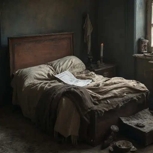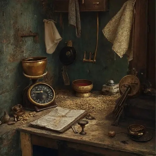 Quiet rumor held that a commissioned ring—intended for a seamstress’s betrothal—failed its first wear, the stone flickering loose within the setting. In the inner hallway, Stefano’s loupe pouch lies torn at the seam. A half-shaped band sits near the wainscoting, its shoulders uneven. A folded slip of revised measurements rests against a baluster, final ratios overwritten. A trail of fine filings spreads across the boards like pale dust from an argument he could not resolve. None of these remnants confirm error, yet each leans toward a burden he carried inwardly.