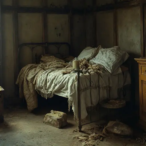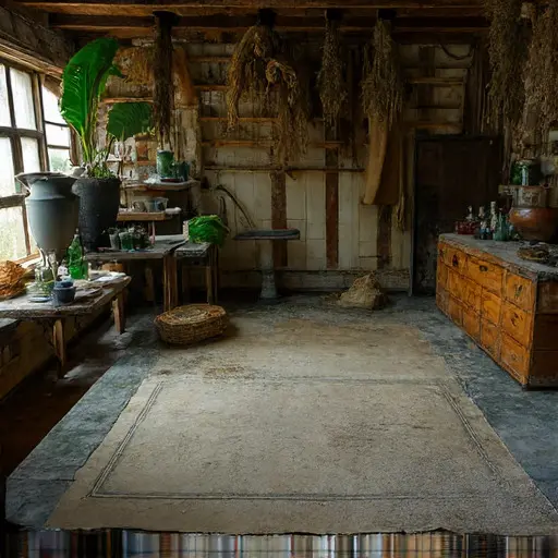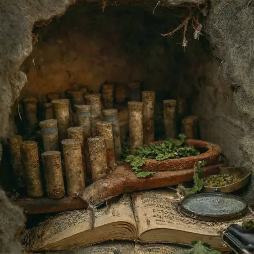 Quiet rumor suggested that a medicinal batch Damián supplied to a local midwife lost potency, raising quiet, troubled doubts about his once-reliable methods. In the interior corridor, Rosalía’s herb pouch lies torn at the drawstring. A scalpel rests near the wall, blade dulled by an uncharacteristic slip. A correction sheet leans beneath a carved niche, its botanical diagrams overwritten in faltering graphite. A thin scatter of dried mint crosses a single stair, as though shaken loose from a trembling hand. None of these things confirm fault, yet each leans toward a tightening strain he carried alone, paced in small circles no one witnessed.