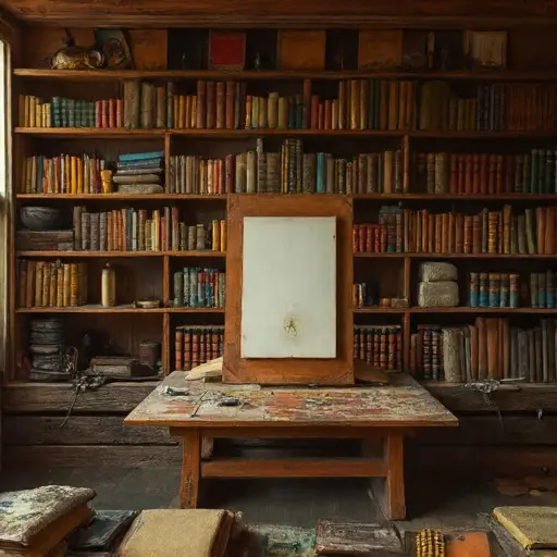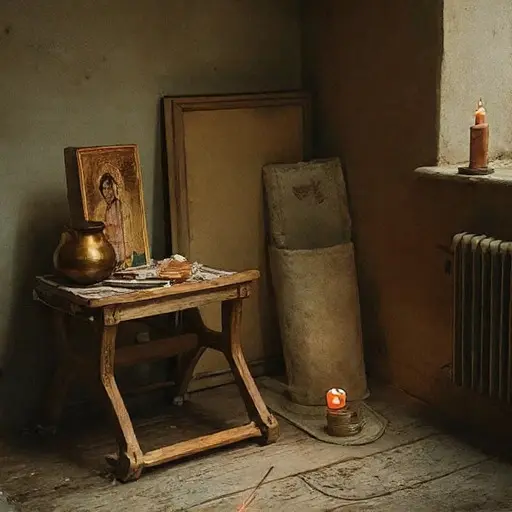 Dimitrios, icon painter, born 1874 in Thessaloniki, learned his practice from his aunt Eleni Giannopoulou, whose palette—stained by years of ochre—rests on a side stool. His days traced a solemn rhythm: dawn mixing of dry pigments, patient gilding toward midday, quiet layering of tempera through dusk. His precision endures in the arranged brushes, their bristles combed flat; in the stacked boards sanded smooth; in the egg cups labeled with small, careful script. The room still blushes with the warmth of his methodical faith.