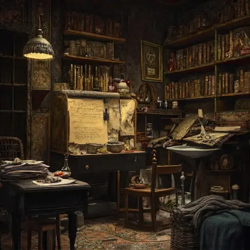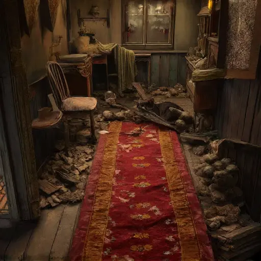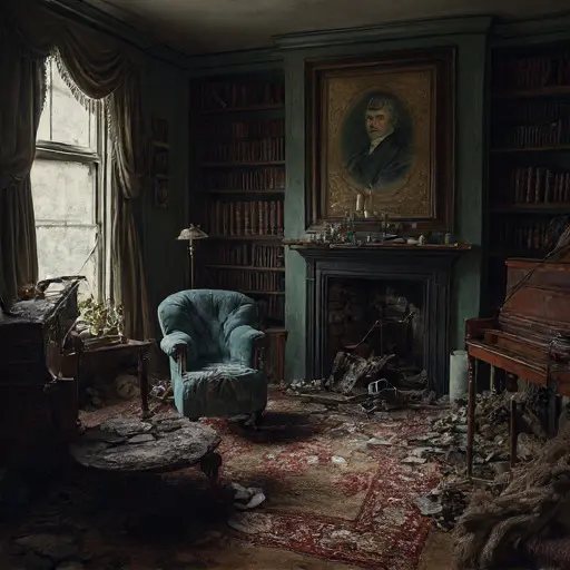Entering the parlour of Morrowveil Asterwyck House, one feels a low hush settle in layers: dust along softened chair arms, stale wool clinging to collapsed cushions, cooled tea scent faintly rising from abandoned saucers. Nothing has shifted outward; everything folds inward, as though daylight itself once entered and chose never to return.