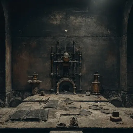 Alchemist Master Elementum Vacuum was last heard working in his laboratory, followed by a sudden, intense sound of heavy glass shattering and metal grinding (from the alembic and the pestle) and then immediate, profound silence. He did not leave the manor. The next morning, the laboratory was cold, the Philosopher’s Chamber sealed, and the man was gone. No body was found, and the only evidence was the singular, physical alteration to his final philosophical work.