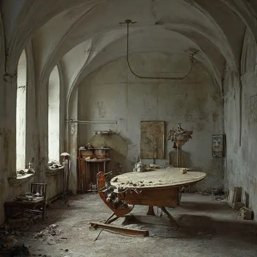 The ultimate chilling clue is the small hole in the linen canvas. It is the final masterpiece—the Zero Canvas achieved, representing the cessation of all artistic existence and the perfect, objective truth found in a single, un-dimensioned point of pure, absolute nothingness. The broken pantograph and blank canvas ensure no further attempt could be made to chart the flawed, seen world. This abandoned Victorian House, with its silent chambers and broken tools, stands as a cold, imposing testament to the master artist who pursued the ultimate, pure form of beauty, and who, in the end, may have successfully defined the Perfect Non-Aesthetic, vanishing into the un-pictured, objective finality that he engineered as his final, terrifying statement of pure existence.