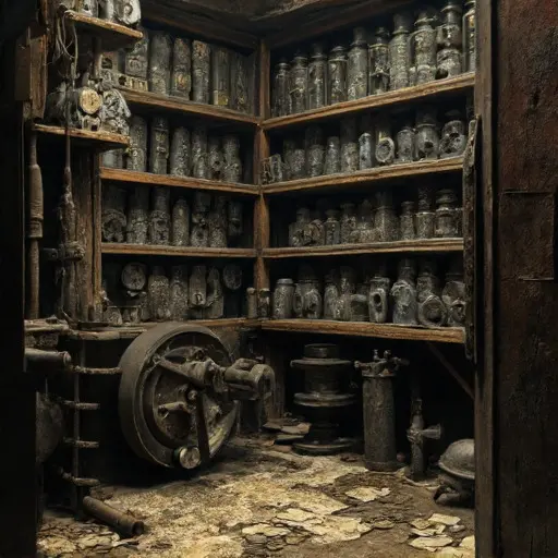 The house preserves his systematic rigor structurally. Many internal passages are fitted with small, precisely calibrated leveling stabilizers and temperature neutralizers built into the concrete, now all rusted and frozen, remnants of his attempts to create a universal, absolutely fixed and non-decaying environment within the manor.