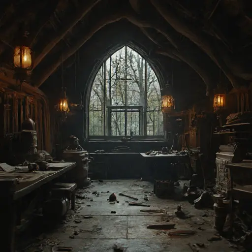 High above the ruined halls, the attic reveals the private world Aldric never shared. Blueprints curl at the edges, detailing intricate illusions unfinished at his disappearance. Chalk symbols sweep across the floor in looping, desperate patterns, suggesting an obsession that outgrew the stage. A cracked stained-glass window casts fractured colors over the relics, creating an otherworldly glow that shifts with each passing cloud.
