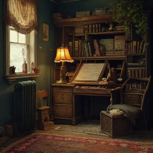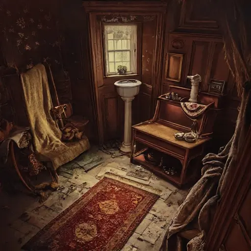 The parlour of Ravenwynd Asterholme House feels shaped by a domestic rhythm that ended without ceremony. Air steeped in the faint scents of cooled tea, brittle wool, and ink left uncapped settles over every softened edge. Deep cushions bear the lasting impressions of quiet routines maintained until they simply collapsed into stillness.